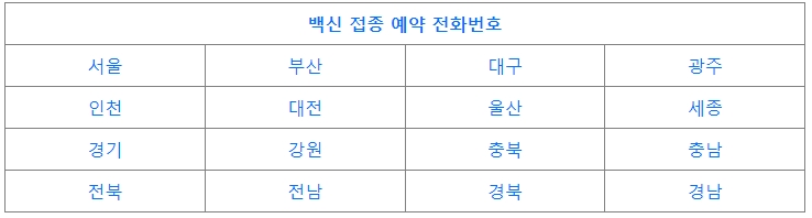 지역마다 백신 접종 예약 전화번호를 아래에 정리해드리니 현재 거주하시고 계신 지역의 예약 전화번호를 확인하시고 예약을 해보시길 바랍니다.
