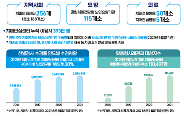 아울러 국가치매관리체계를 강화하기 위해 중앙치매센터(중앙)-광역치매센터(시·도)-치매안심센터(시·군·구)로 이어지는 치매정책 전달체계도 정립했다.