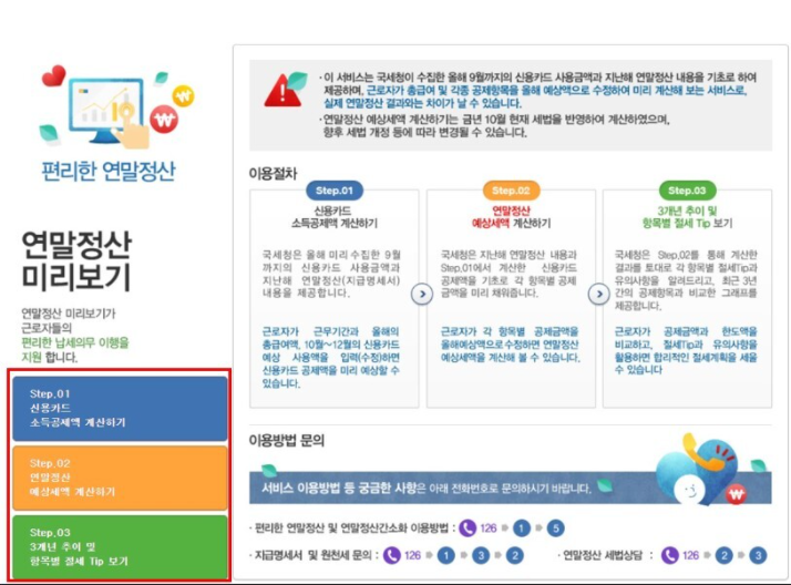 여기 보시면 왼쪽에 이렇게 Step1~Step3까지 나오는데 우선은 이 첫 번째 항목인 Step1에 있는 신용카드 소득공제 계산하기를 눌러주세요