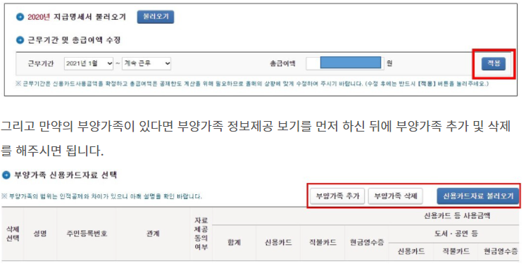 그 다음에 신용카드 자료 불러오기를 눌러주시면 신용카드 등 사용 금액이 자동으로 입력됩니다