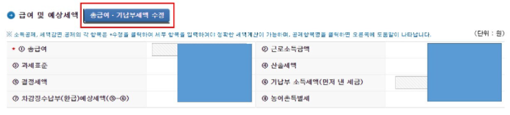정보 입력을 정확히 하기 위해서, " 총급여/기납부세액 수정" 버튼을 클릭해 주세요