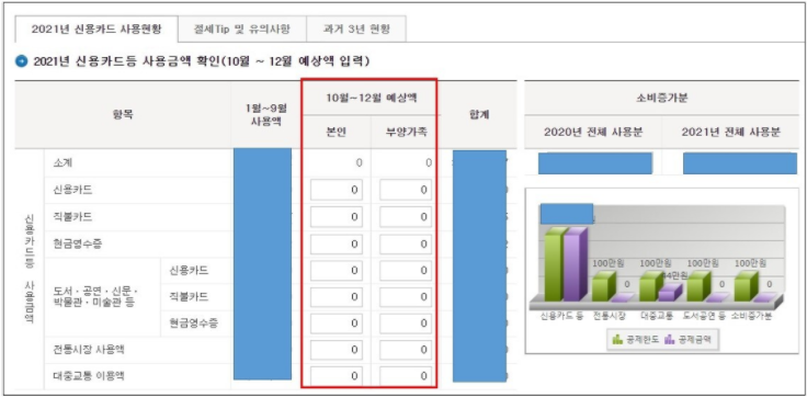 신용카드, 직불카드, 현금영수증 등의 자료가 자동으로 입력된 화면을 보실 수 있는데요. 1~9월 사용액은 실제 사용한 금액이라고 보시면 되고, 10~12월 예상 금액을 입력하시면 됩니다.