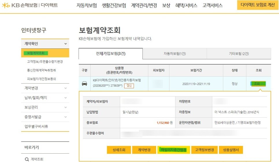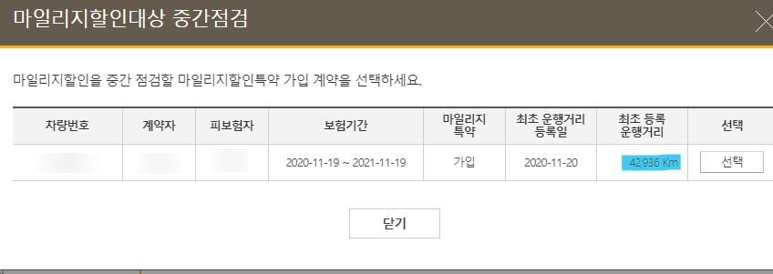 2. 보험계약조회 - 자동차보험 항목 선택 [조회]- 마일리지중간점검 Click