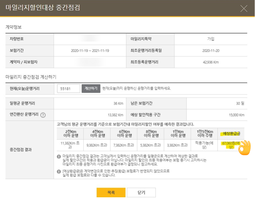 보험만기 때 운행거리 - 보험가입시청 운행거리 = 1만 5천km 이하면 할인율에 따라 금액이 정해집니다.