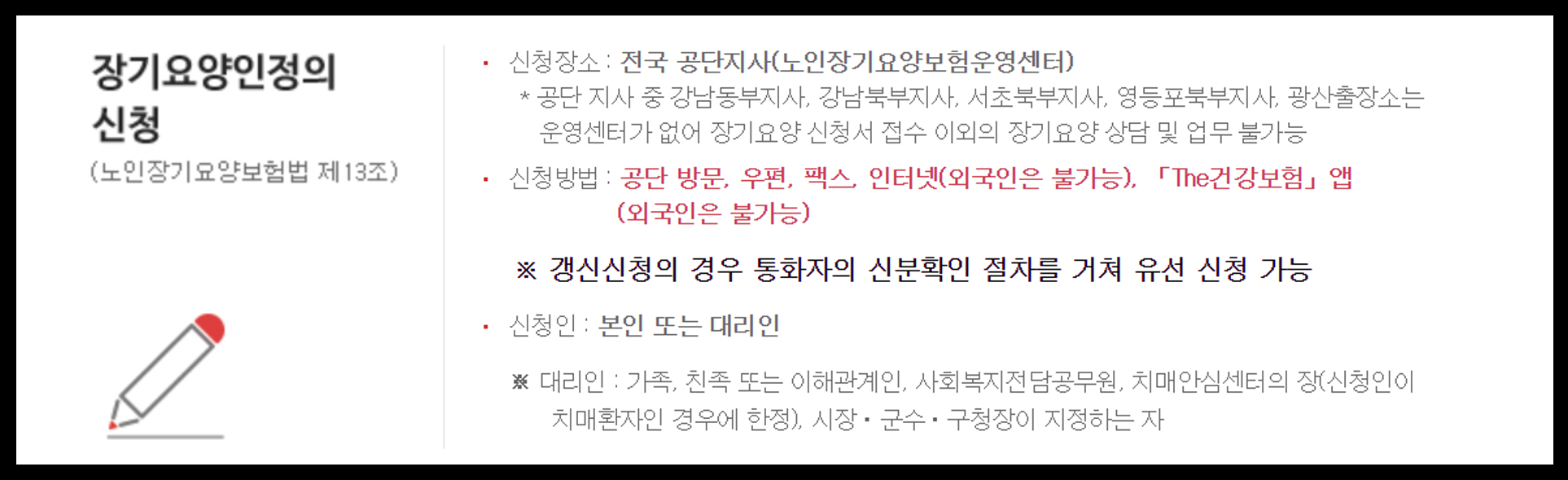 장기요양보험에 대한 더 자세한 정보를 알아보고 싶으시다면 국민건강보험공단 노인장기요양보험 홈페이지에 방문하여 “제도소개” 항목을 참고하시기 바랍니다.